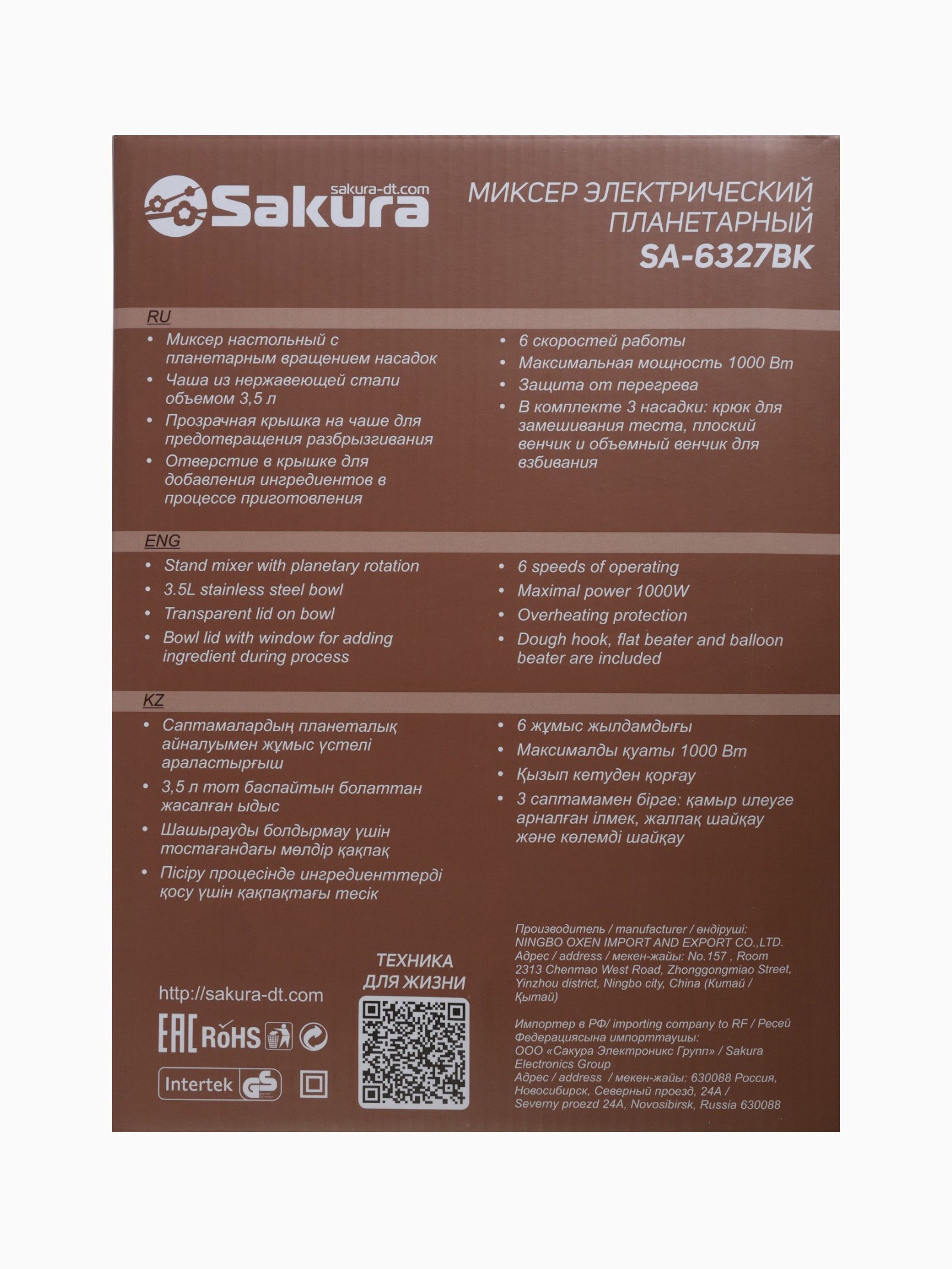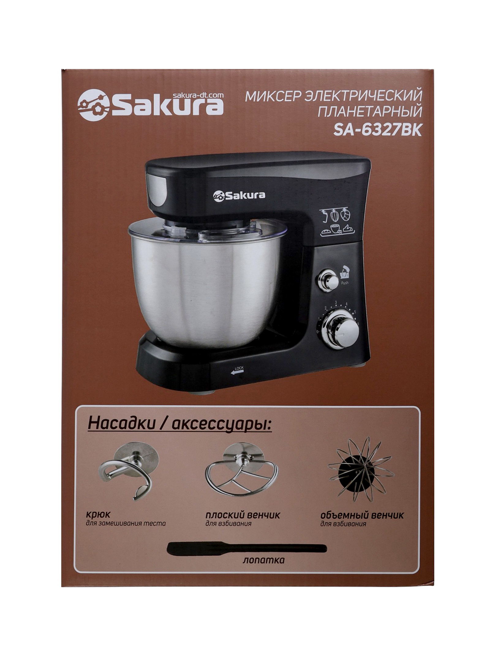 Миксер планетарный SA-6327BK, 1000 Вт, 6 скоростей, чаша 3.5 л, 3 насадки, чёрный, SAKURA, Китай