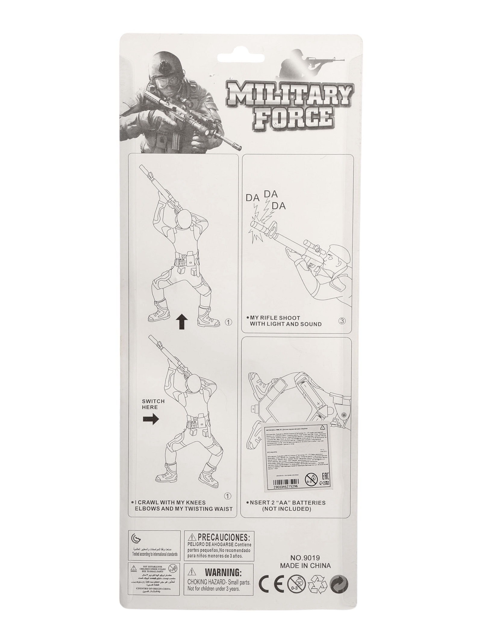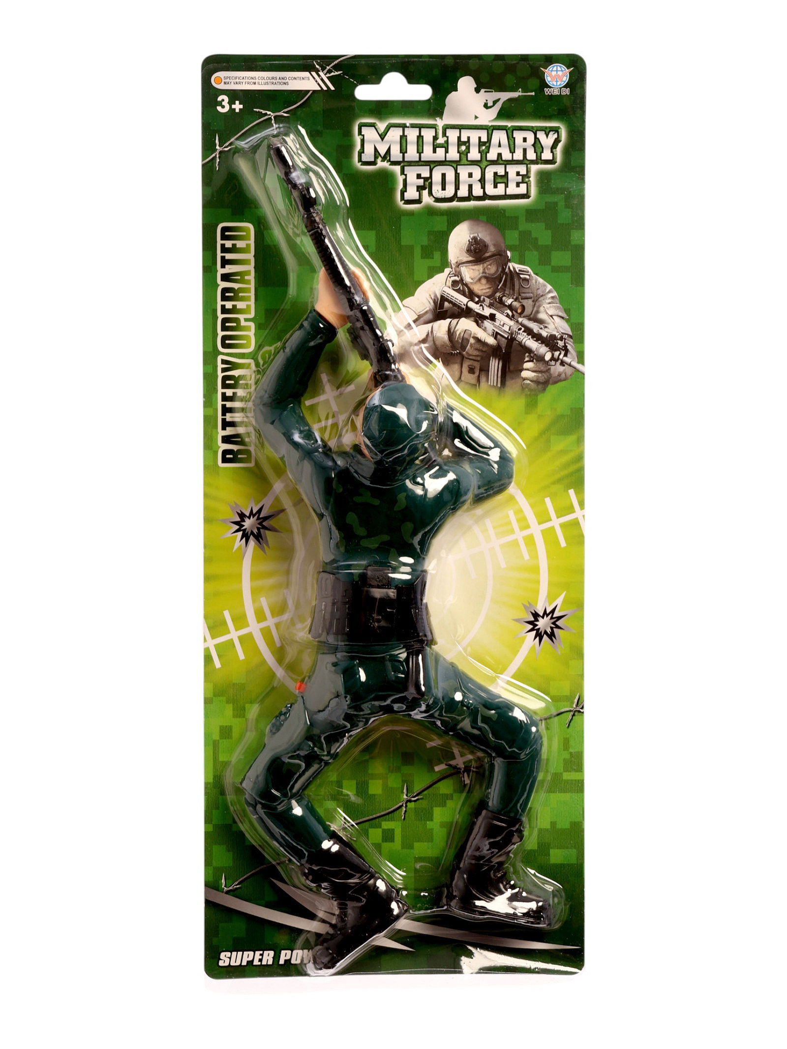 Размер упаковки: 7 x 37 x 16 см. Для кого: Для мальчика tnved: 9503008000 Возраст: От 3 лет Батарейки в комплекте: Нет Количество батареек: 2 Звук: Да Свет: Да Типоразмер батареек: AA (LR6) Набор: Нет Тематика праздника: 23 Февраля Вид: Солдатики Тематика: Люди С фигуркой солдатика "Пехотинец" малыш почувствует себя настоящим спецназовцем, который готов на выполнение важной миссии. Благодаря способности ползать по поверхности, солдат сможет незаметно подобраться к врагу и нанести решающий удар! А оружие в комплекте сделает игру ещё реалистичнее и интереснее. Особенности