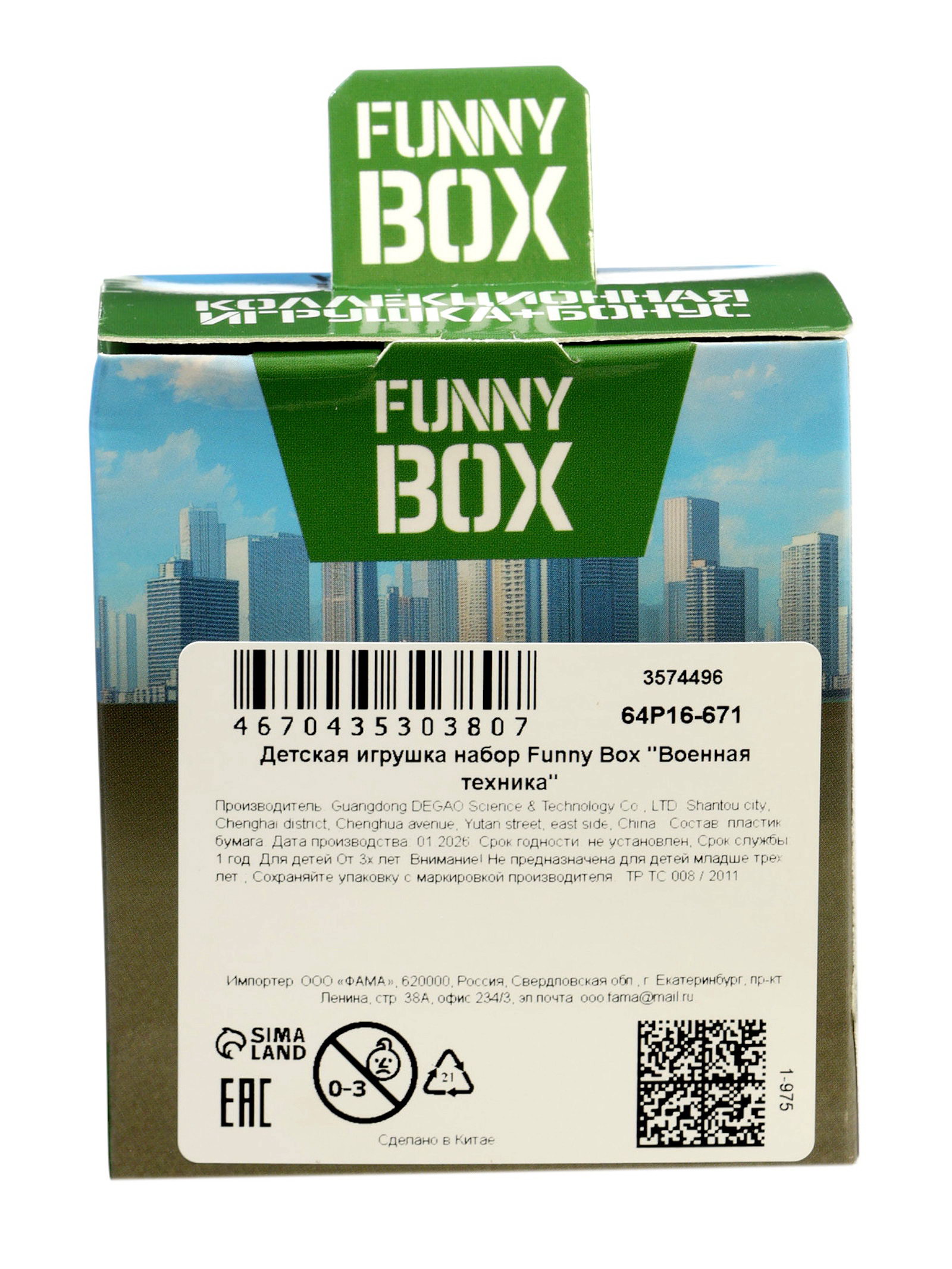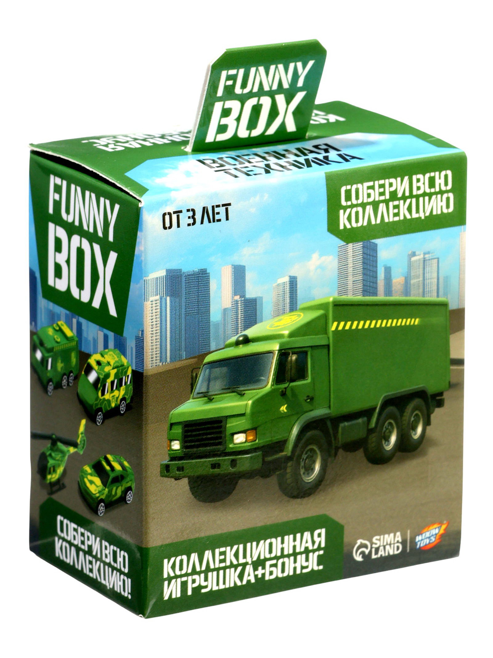 Размер упаковки: 4.5 x 8 x 4.5 см. tnved: 9503007000 Тип механизма: Без механизма Назначение транспорта: Боевой Вид упаковки: Коробка Возраст: От 3 лет Цвет: Зелёный Для кого: Для мальчика Игровой набор Funny Box "Военная техника" это маленькая коробочка с большой радостью внутри. Каждый набор – это загадка, ведь вы не узнаете, какая именно фигурка спрятана внутри, пока не откроете коробку. Особенности