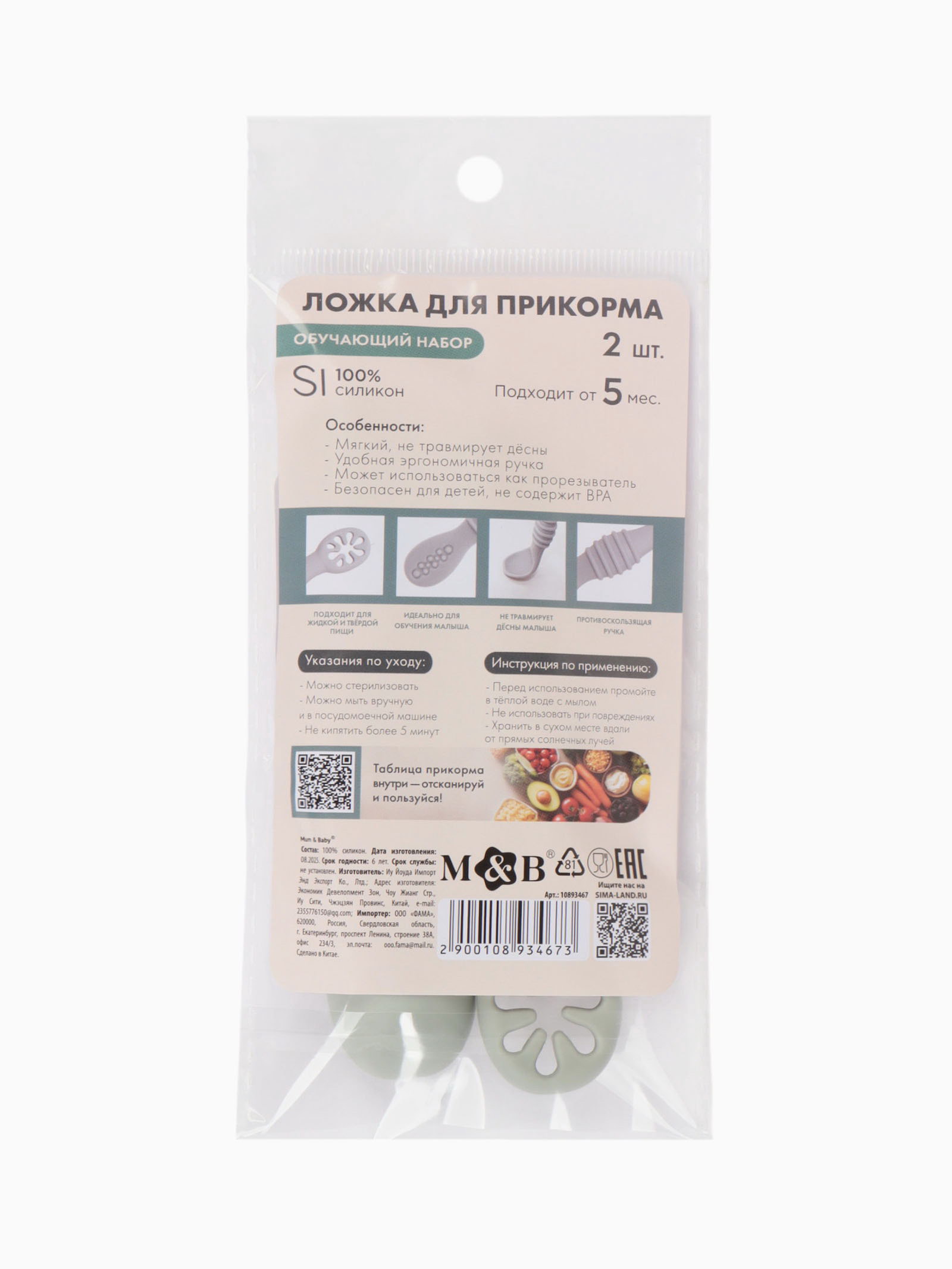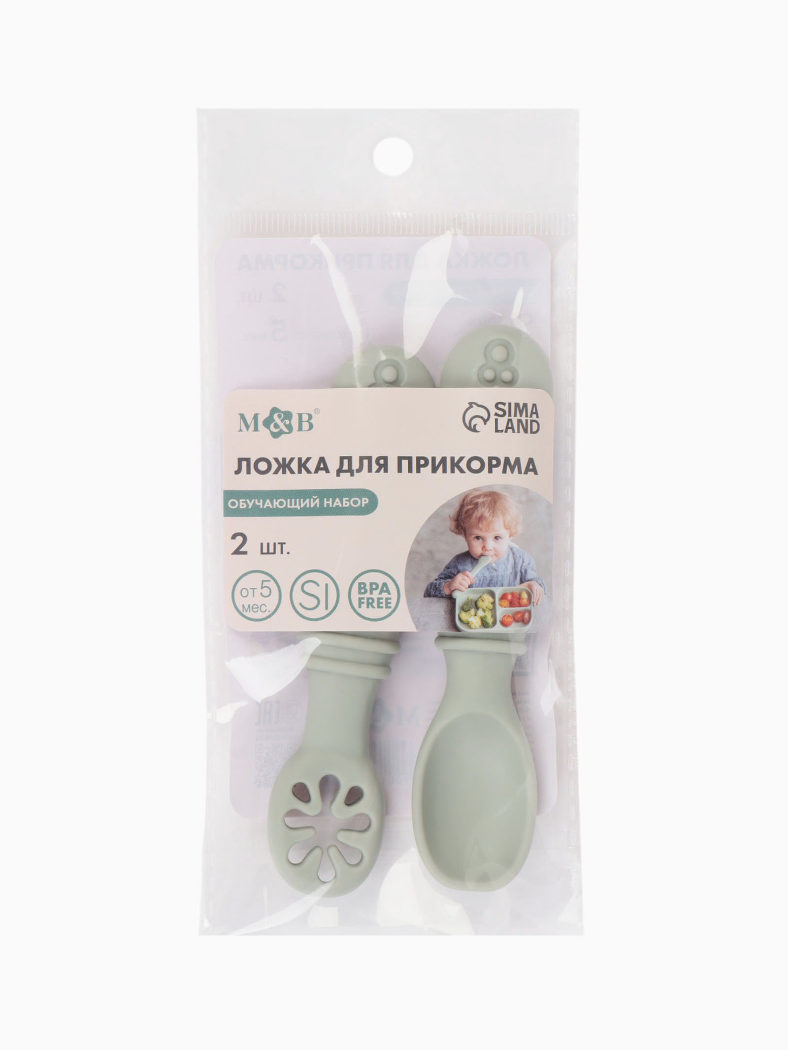 Ложка детская для прикорма, силикон, набор 2 шт., серый M&B, 2.5x11.2x1.5 см., Mum&Baby, Китай