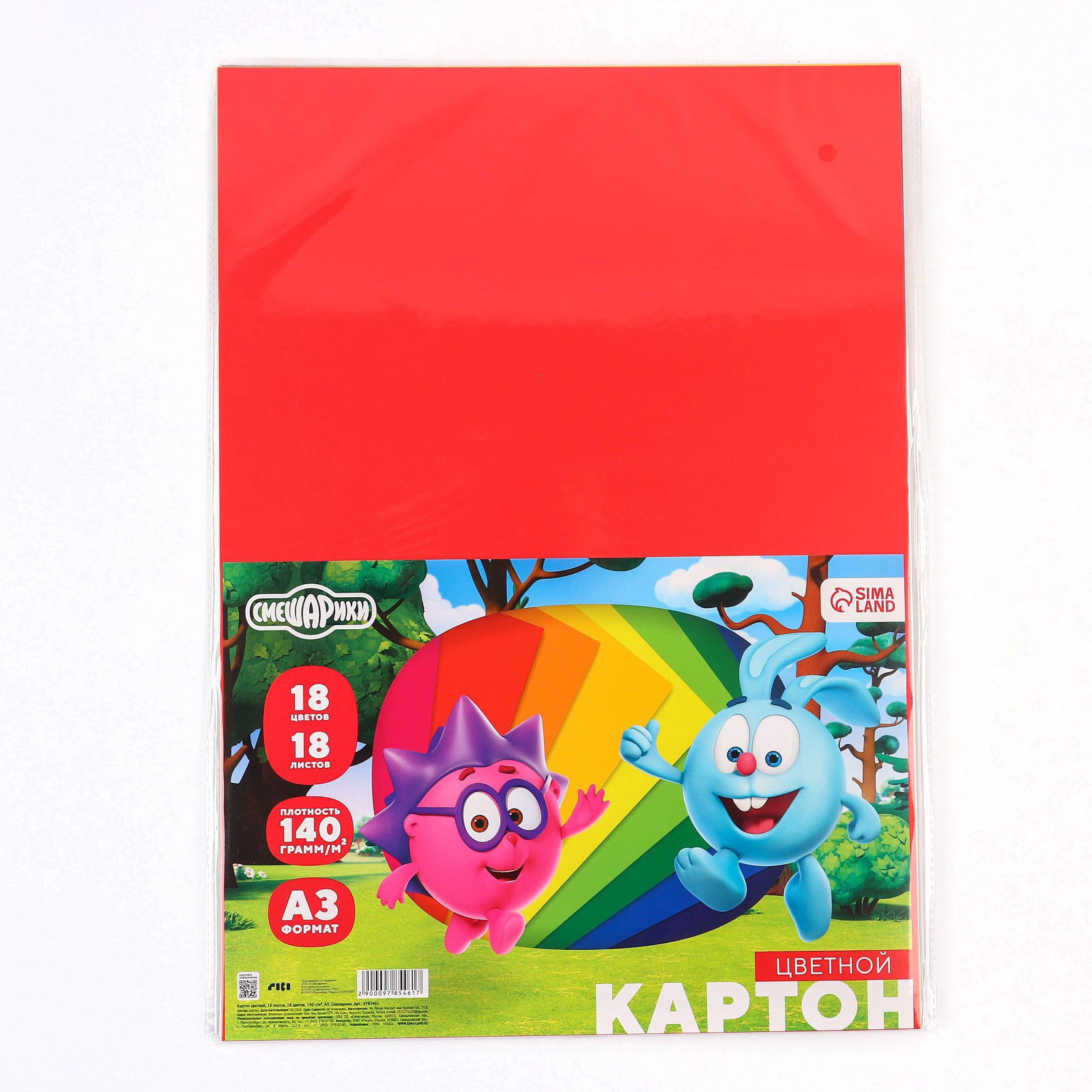 Картон цветной тонированный, А3, 18 листов, 18 цветов, немелованный, двусторонний, в пакете, 140 г/?2, 38.9x54.6x4.6 см., Смешарики, Китай