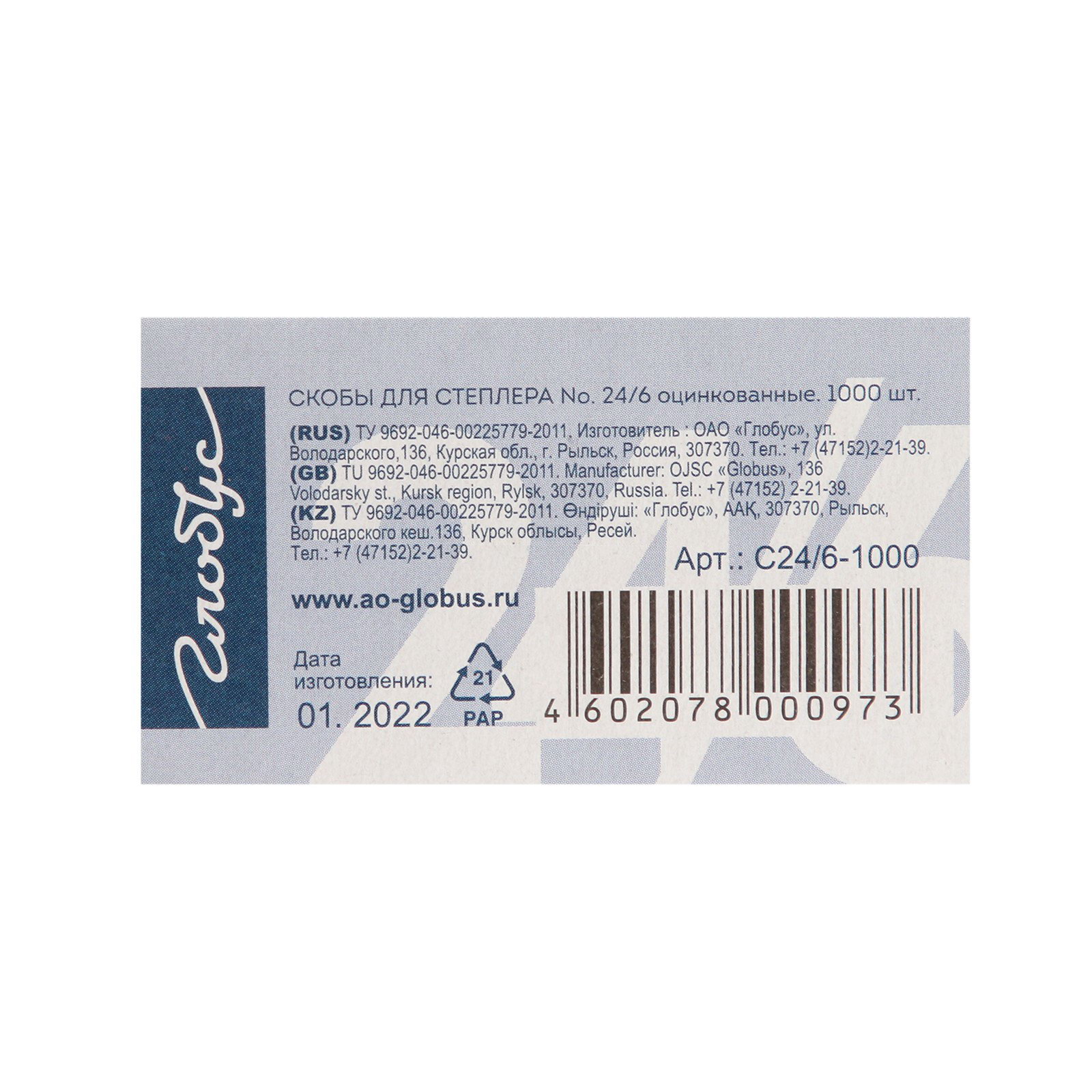 Скобы металлические №24/6, для степлера, 1000 шт., высококачественная сталь, GLOBUS, Россия