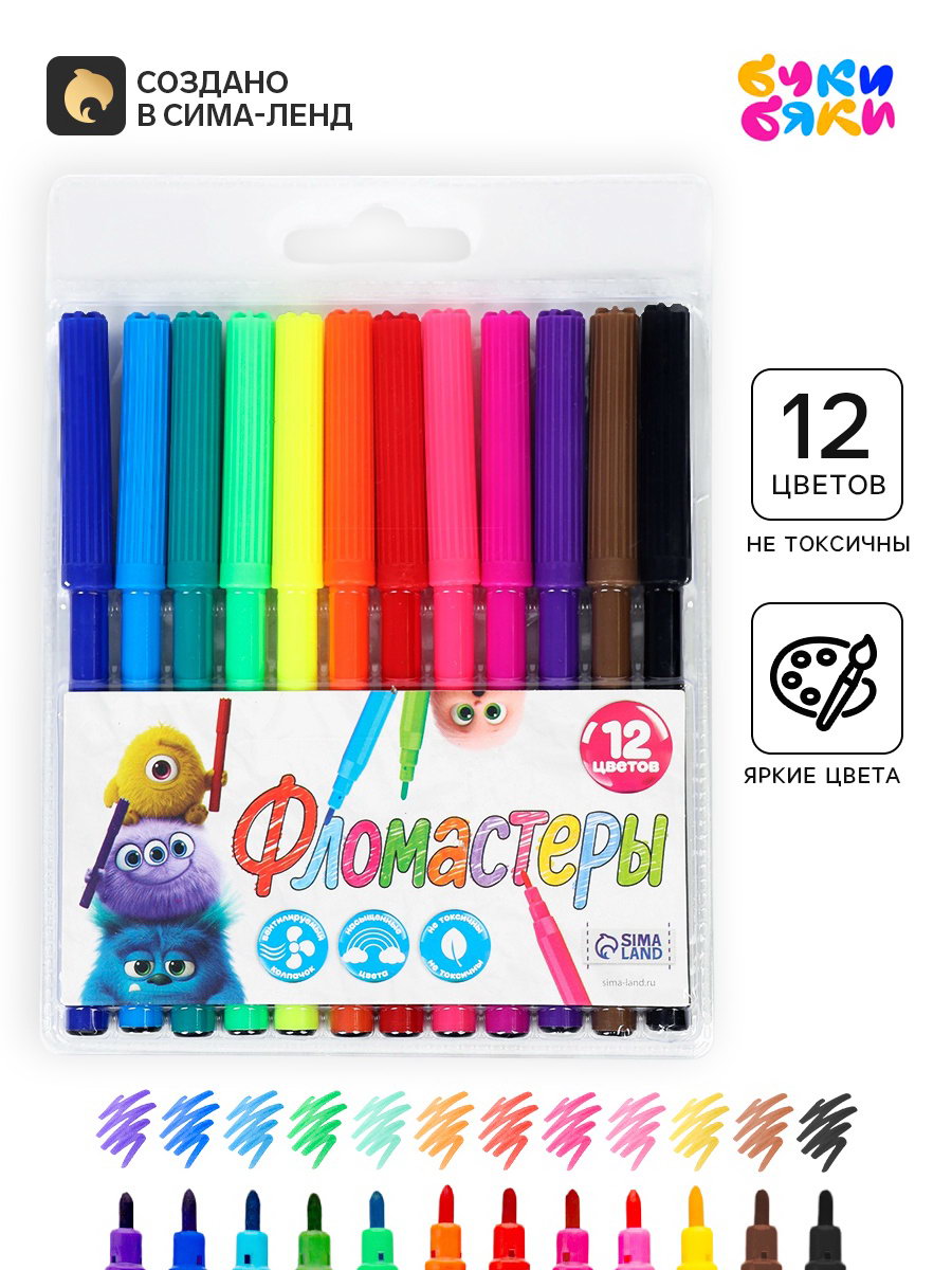 Фломастеры 12 цветов, Букибяки, 11.3x15.7x1 см., Буки Бяки, Китай