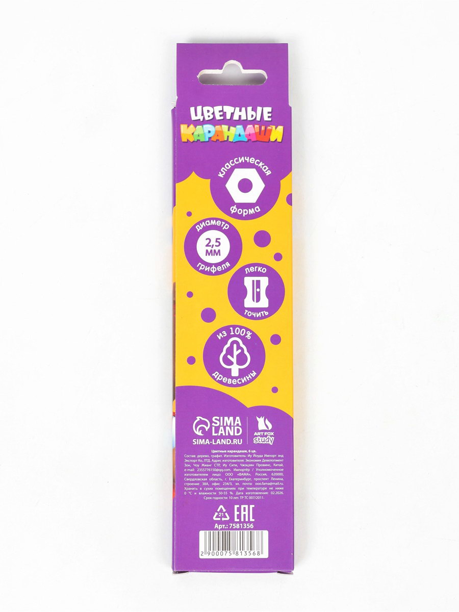 Цветные карандаши 6 цветов заточенные шестигранные деревянный корпус, 4.6x20.6x1 см., ArtFox STUDY, Китай