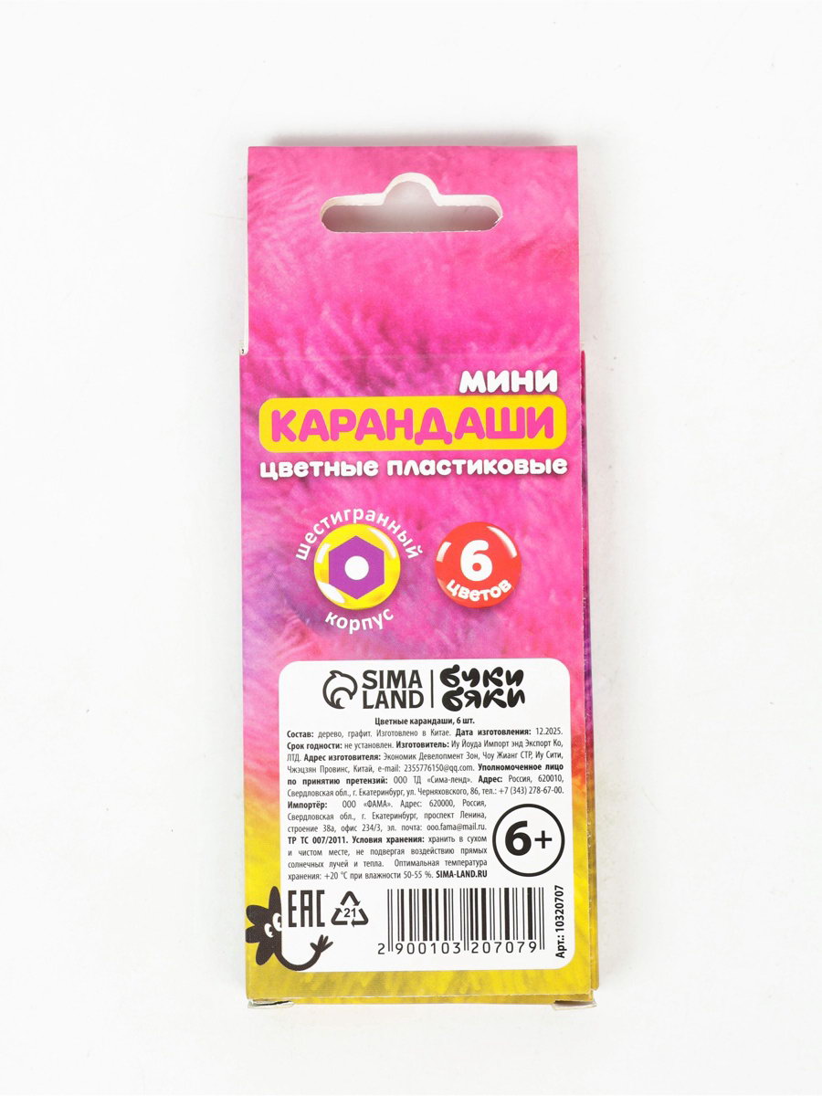 Цветные карандаши, пластиковые, 6 цветов, мини, шестигранные, БукиБяки, 4.8x12x1 см., Буки Бяки, Китай