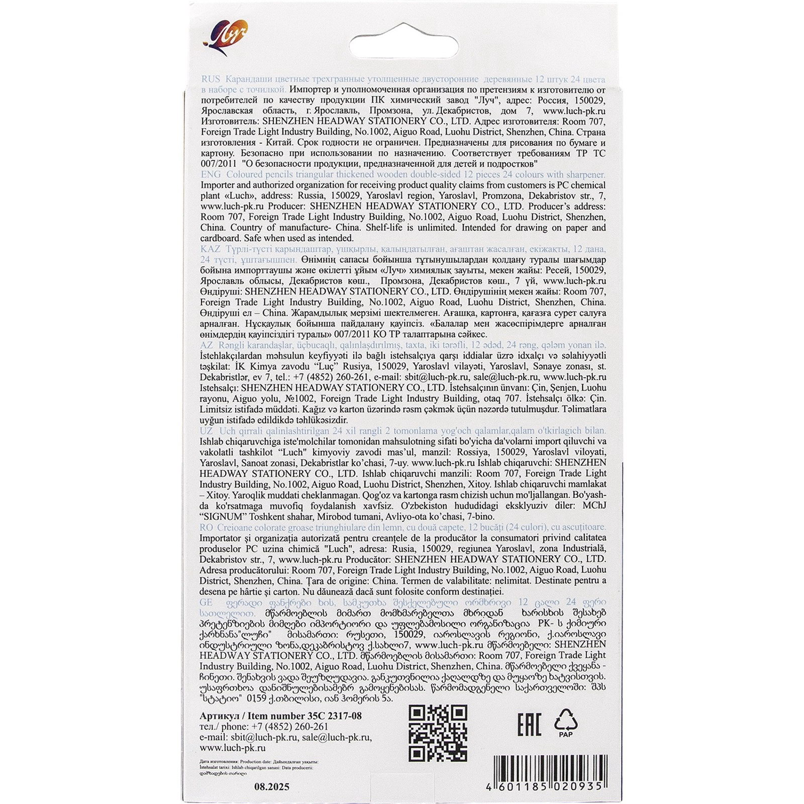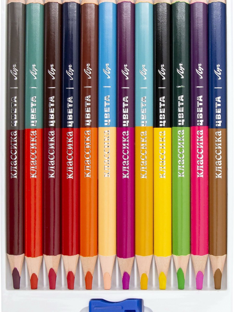 Карандаши 24цв, 12 шт, двусторон, дерево, заточ, трехгр, толстые, с точил, коробка, европодвес, Луч, Китай
