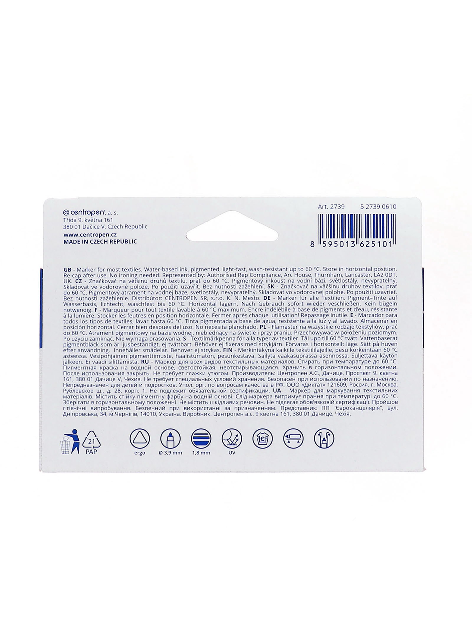 Набор маркеров для ткани 2739, 6 цветов, узел 3.9 мм, линия 1.8 мм, 11.6x15.7x1.6 см., Centropen, Чехия