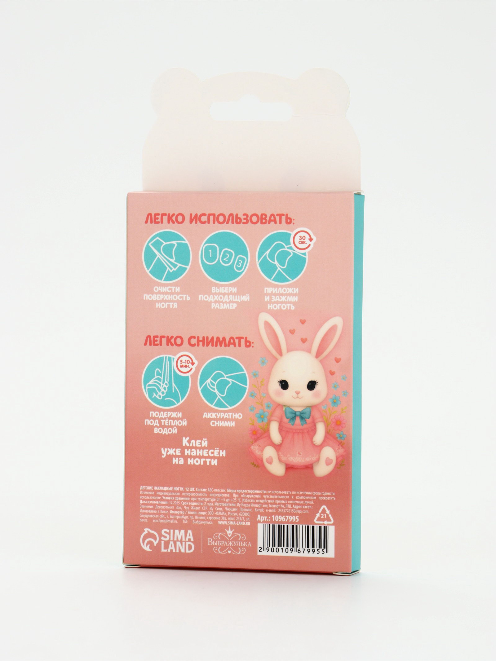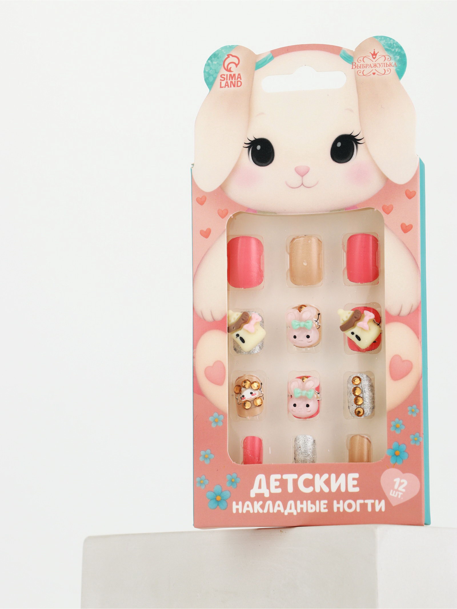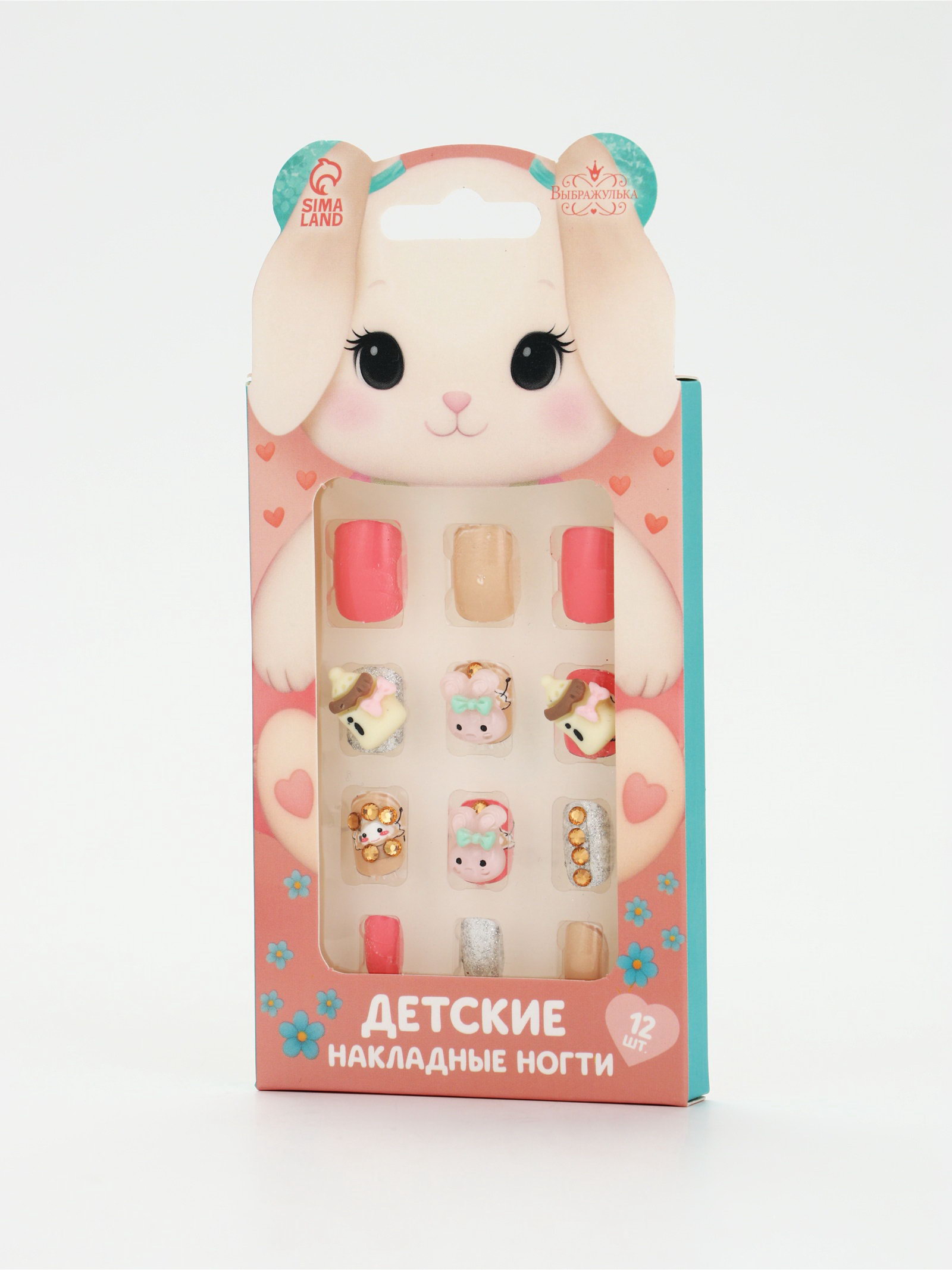Детские накладные ногти "Плюшевый зайка", 12 шт., 7.3x15.4x1.2 см., Выбражулька, Китай