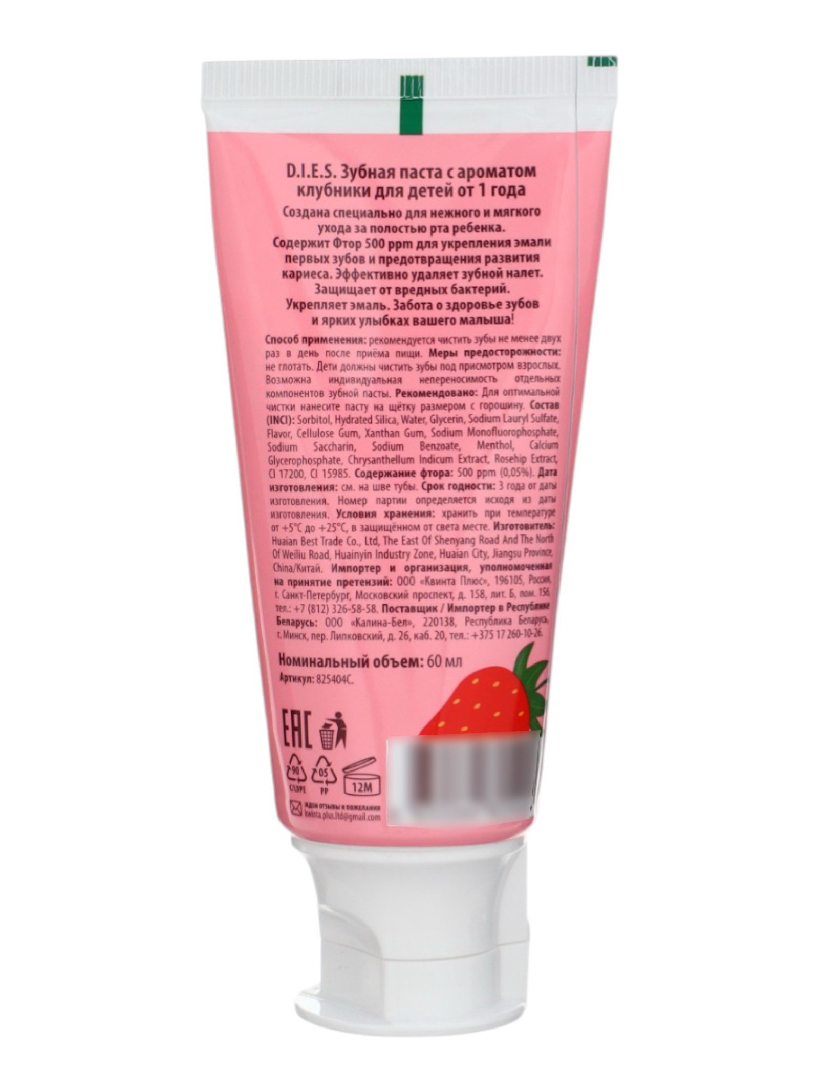 Зубная паста детская "Спелая клубника", от 1 года, 60 мл, D.I.E.S., Китай