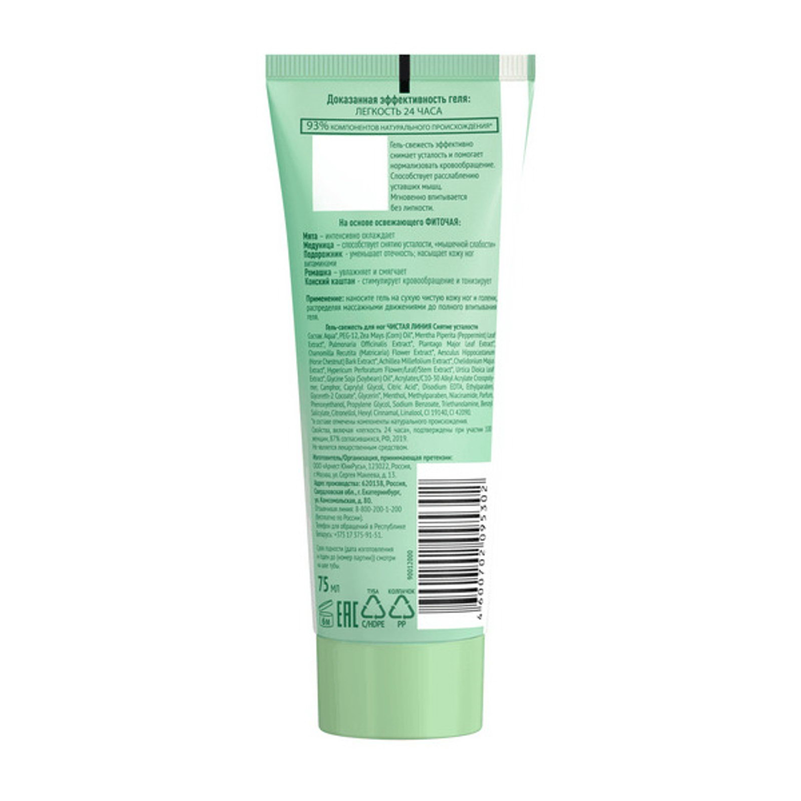 Размер упаковки: 5.5 x 3.5 x 13.5 см. tnved: 3304990000 Вид: Гель Вид: Гель Для легкости ножек попробуйте гель-свежесть Чистая Линия снятие усталости. Формула продукта разработана на основе освежающего фиточая с мятой, медуницей, подорожником, ромашкой, конским каштаном. Гель эффективно снимает усталость и помогает нормализовать кровообращение. Способствует расслаблению уставших мышц. Мгновенно впитывается без ощущения липкости. Способ применения:Наносите гель на сухую чистую кожу ног и голени, распределяя массажными движениями до полного впитывания геля. Меры предосторожности:Избегать контакта с глазами. Состав продукта:Aqua*, PEG-12, Zea Mays (Corn) Oil*, Mentha Piperita (Peppermint) Leaf Extract (экстракт мяты)*, Pulmonaria Officinalis Extract (экстракт медуницы)*, Plantago Major Leaf Extract (экстракт подорожника)*, Chamomilla Recutita Flower Extract (экстракт ромашки)*, Aesculus Hippocastanum (Horse Chestnut) Bark Extract (экстракт конского каштана)*, Achillea Millefolium Extract*, Chelidonium Majus Extract*, Hypericum Perforatum Flower/Leaf/Stem Extract*, Urtica Dioica Leaf Extract*, Acrylates/C10-30 Alkyl Acrylate Crosspolymer, Camphor, Caprylyl Glycol, Citric Acid, Disodium EDTA, Ethylparaben, Glycerin*, Glycine Soja (Soybean) Oil*, Menthol, Methylparaben, Niacinamide, Parfum, PEG-40 Hydrogenated Castor Oil, Phenoxyethanol, Propylene Glycol, Sodium Benzoate, Triethanolamine, Benzyl Salicylate, Citronellol, Hexyl Cinnamal, Linalool, CI 19140, CI 42090. *в составе отмечены натуральные компоненты. | ||