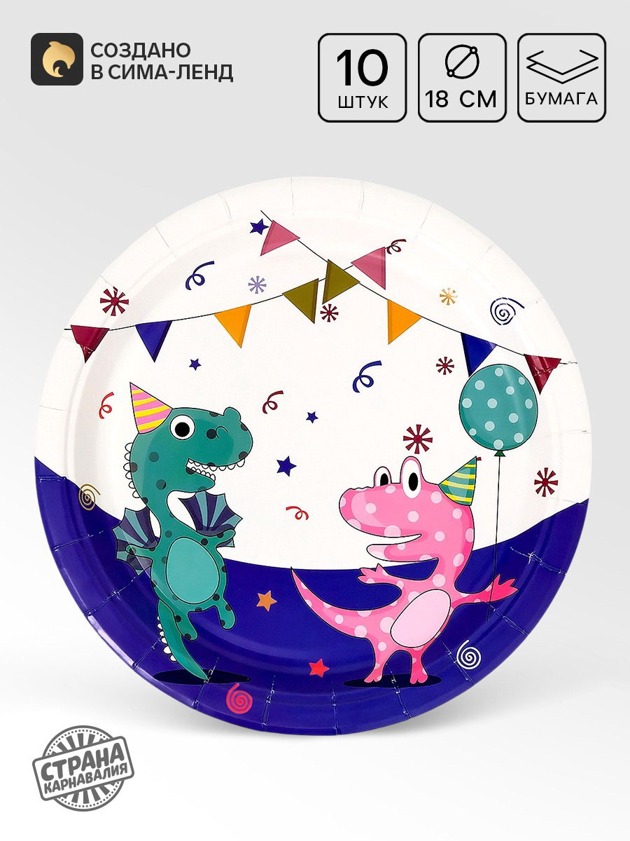 Тарелки одноразовые бумажные "Дино", 10 шт, 18х18х1.5 см., Страна Карнавалия, Китай