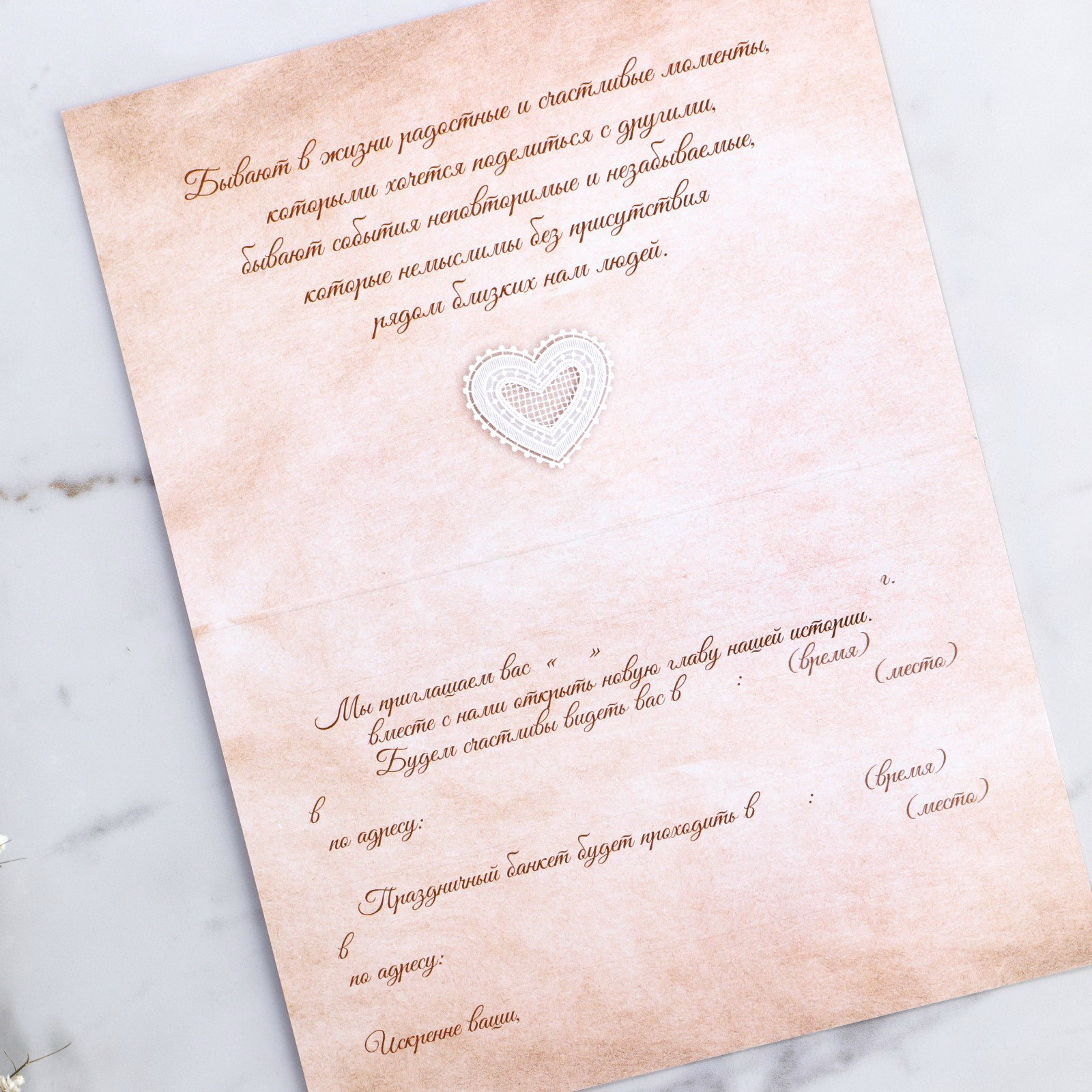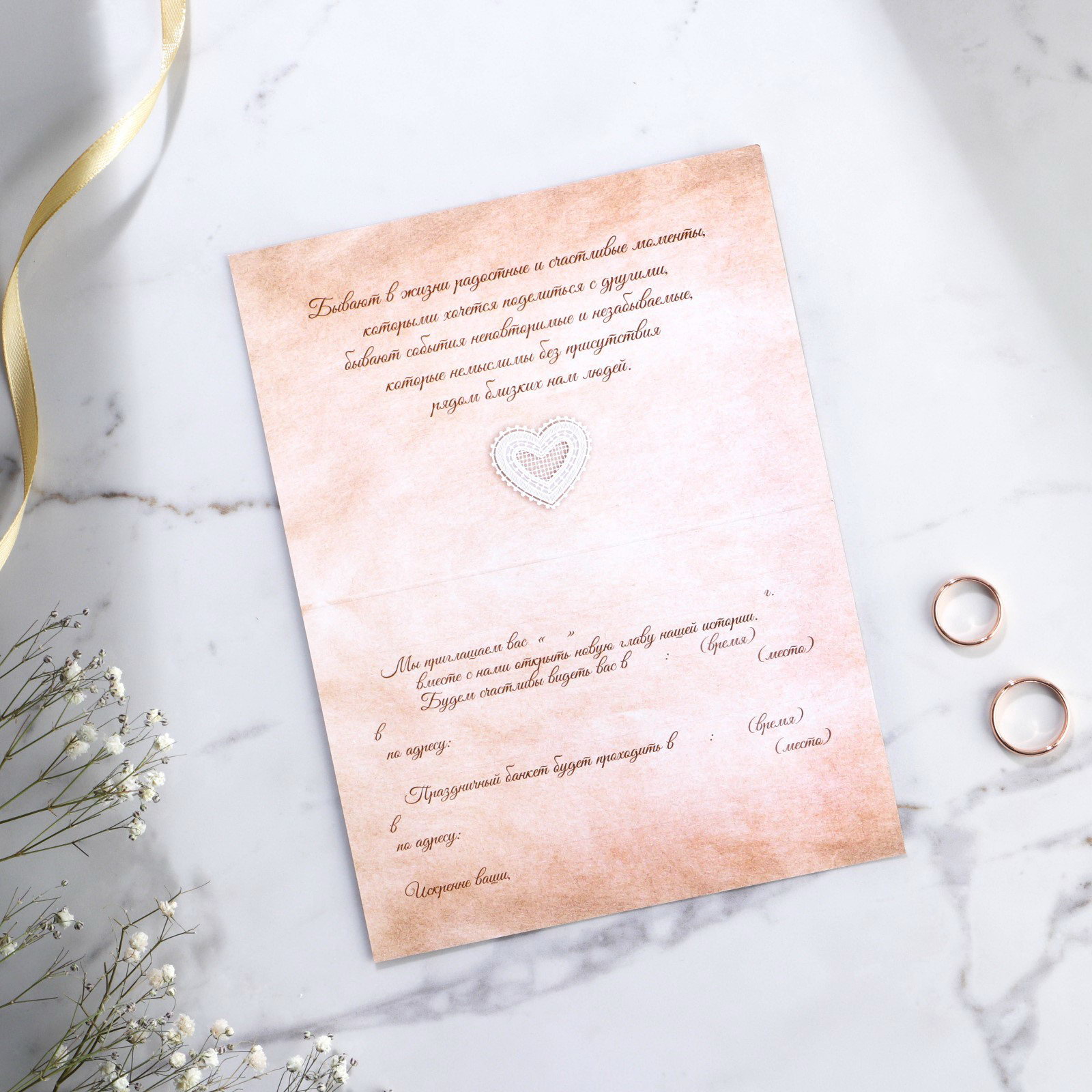 Размер упаковки: 20 x 0.8 x 15 см. Тематика праздника: Свадьба tnved: 4909000000 Размер, см: 10 x 15 Цвет: Белый Плотность, г/?2: 250 Отделка: Без отделки Когда дата и время бракосочетания уже известны, и вы определились со списком гостей, необходимо оповестить их о предстоящем празднике. Существует традиция делать персональные приглашения с указанием времени и даты мероприятия. Но перед свадьбой столько всего надо успеть, что на изготовление десятков открыток просто не остаётся времени. В этом случае вам придёт на помощь уникальное приглашение. Изделие выполнено из картона плотностью 250 грамм и дополненено крафтовым конвертом с наклейкой из самоклеющейся бумаги.. Это придаёт дорогой и роскошный вид. Текст приглашения содержит свободные поля для имени адресата, времени, даты и адреса проведения мероприятия. Это потрясающее приглашение достойно стать частью такого важного события в жизни, как свадьба! | ||