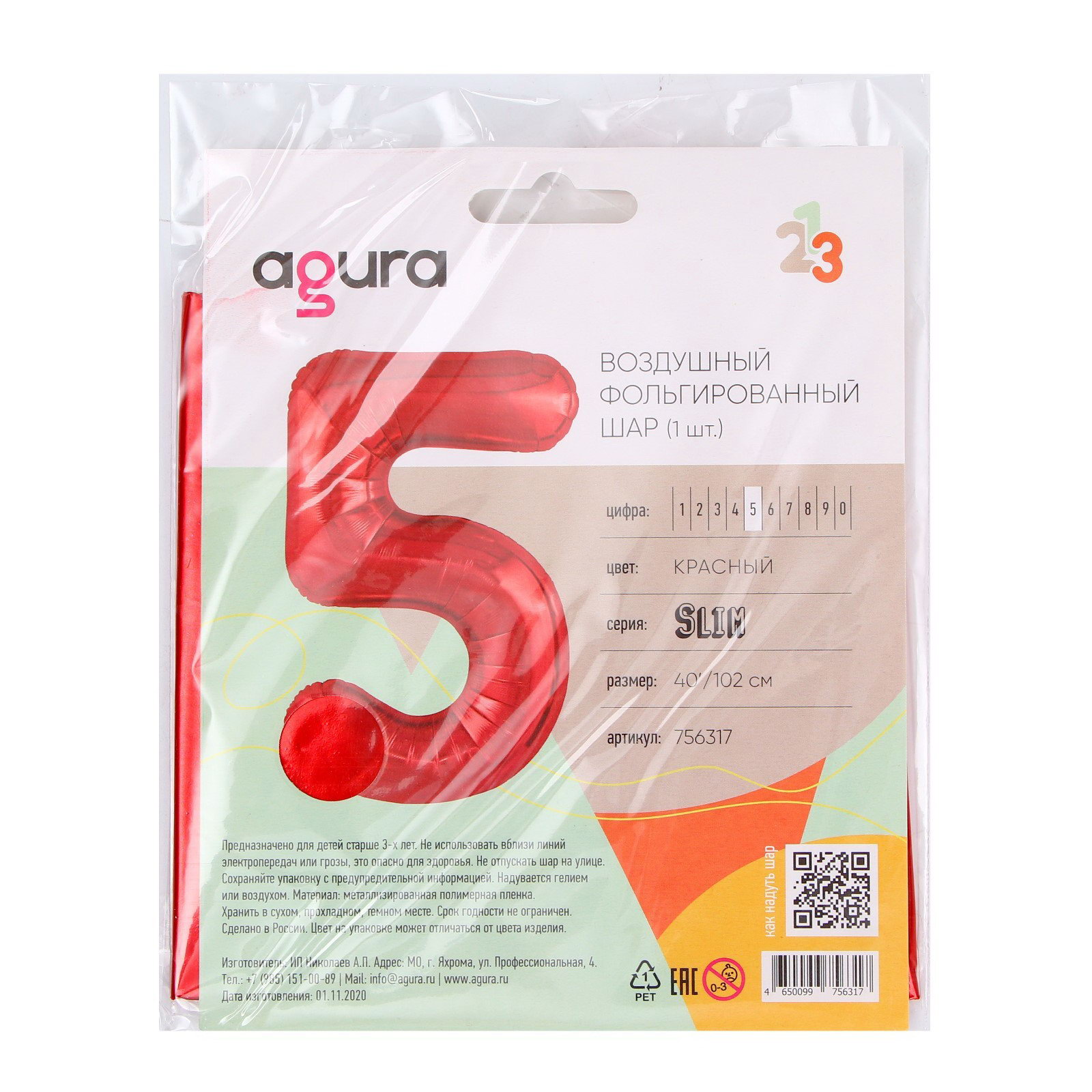Шар фольгированный 40""Цифра 5", цвет красный, Slim, AGURA, Россия