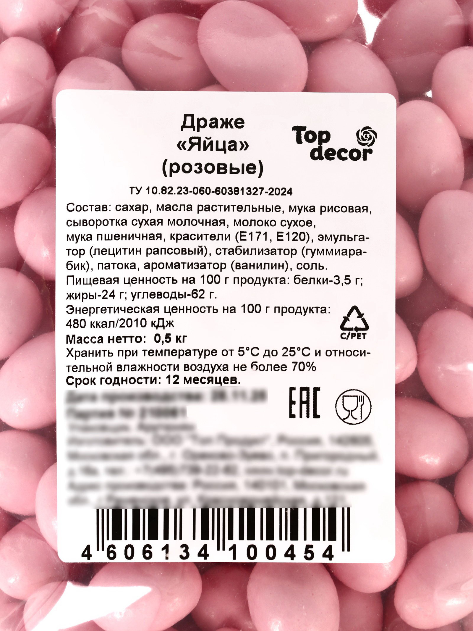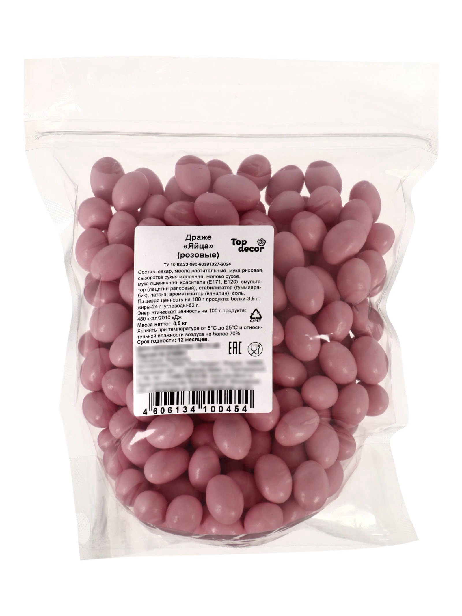 Размер упаковки: 17 x 6 x 20 см. tnved: 1806329000 Продукты: Да Температурное ограничение: Нет Вид: Драже Вес нетто, г: 500 Тематика праздника: Пасха Вид упаковки: Пластиковая упаковка Вкус: Ваниль Розовые драже-яйца мягкий по настроению кондитерский декор для десертов с тёплой и дружелюбной подачей. Оттенок ассоциируется с заботой и нежностью, поэтому оформление выглядит уютно и понятно. Такой цвет легко воспринимается и не перегружает композицию. Форма яйца органично вписывается в пасхальные сюжеты, детскую выпечку и десерты для семейных праздников. Розовые драже хорошо сочетаются с белыми и кремовыми покрытиями, шоколадом и пастельной палитрой, помогая создать гармоничный визуальный ритм без резких акцентов. Где и как используют