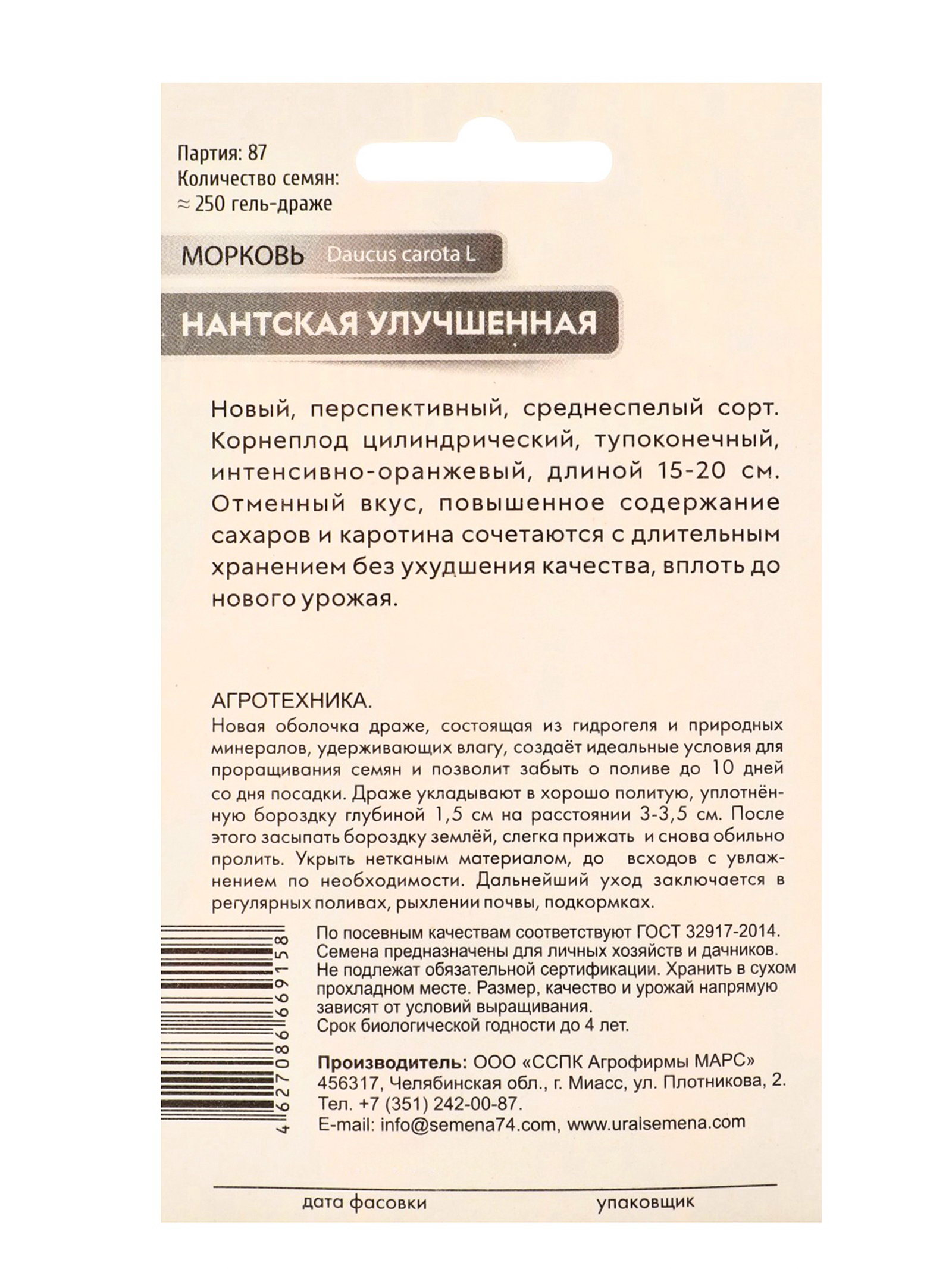 Семена Морковь "Нантская улучшенная", гелевое драже, 250 шт., "Уральский дачник", Уральский Дачник, Россия