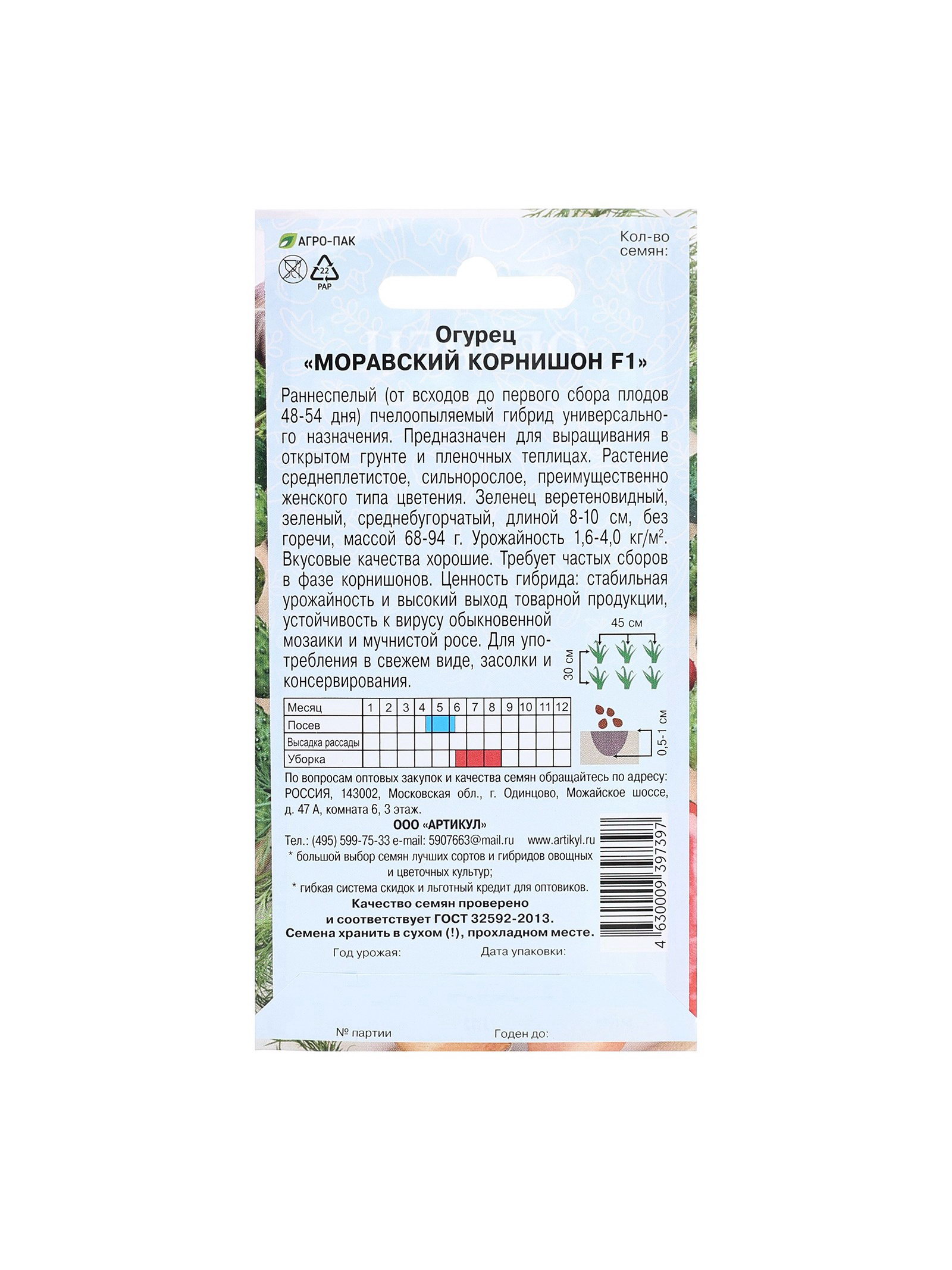 Сроки созревания: Ранний, Средний (от 48 до 60 дней) Посев (посадка) в грунт: Июнь, Май Посев на рассаду: Апрель, Май Размер упаковки: 8 x 0.1 x 5 см. Ампельные: Да Вьющиеся (лианы): Да Размер: Среднеплодные (от 18 до 22 см) см tnved: 1209918000 Применение: Универсальное Форма: Цилиндрическая Тип поверхности: Среднебугорчатый Урожайность, ?2: [1.06,4] Температурное ограничение: Нет Место выращивания: Универсальный Сорт или гибрид: Гибрид F1 Сорт: F1 Тип: Пчёлоопыляемый "Огурец Моравский корнишон F1 - это гибридный сорт огурцов, который отличается высокой урожайностью и прекрасным вкусом. Этот сорт был выведен специалистами селекционной компании и является одним из наиболее популярных среди садоводов и огородников. Огурцы Моравский корнишон F1 имеют удлиненную форму и ярко-зеленый цвет. Они достигают длины до 10 см и имеют тонкую кожицу, что делает их идеальными для консервирования. Кроме того, огурцы этого сорта обладают приятным хрустящим вкусом и ароматом, что делает их прекрасным дополнением к любому блюду. Один из главных преимуществ Моравского корнишона F1 - это его высокая урожайность. За один сезон можно получить до 10 кг огурцов с одного куста. Кроме того, этот сорт отличается устойчивостью к болезням и вредителям, что позволяет выращивать его без использования химических препаратов. Огурцы Моравский корнишон F1 легко выращивать как в открытом грунте, так и в теплице. Для получения высоких урожаев рекомендуется высаживать рассаду в грунт в конце мая - начале июня. Для обеспечения хорошего роста и развития растений необходимо регулярно поливать их и подкармливать комплексными удобрениями. В заключение можно сказать, что огурцы Моравский корнишон F1 - это отличный выбор для тех, кто хочет получить высокие урожаи вкусных и качественных огурцов. Благодаря своим прекрасным вкусовым качествам и устойчивости к болезням этот сорт пользуется заслуженной популярностью среди садоводов и огородников." | ||