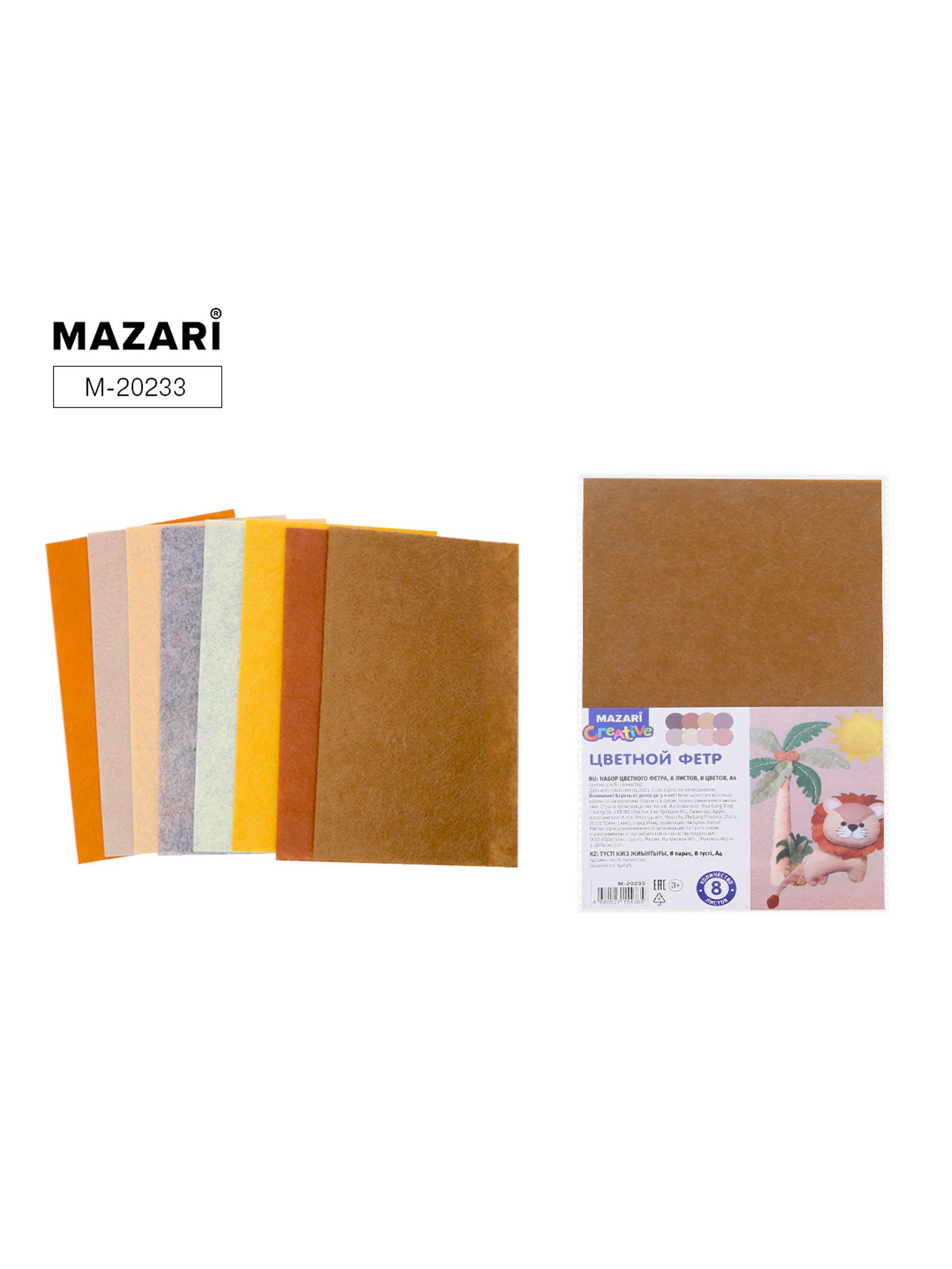 Фетр "Бежевый" 8 листов, 8 цветов, формат А4, толщина 1 мм, MAZARI, Китай