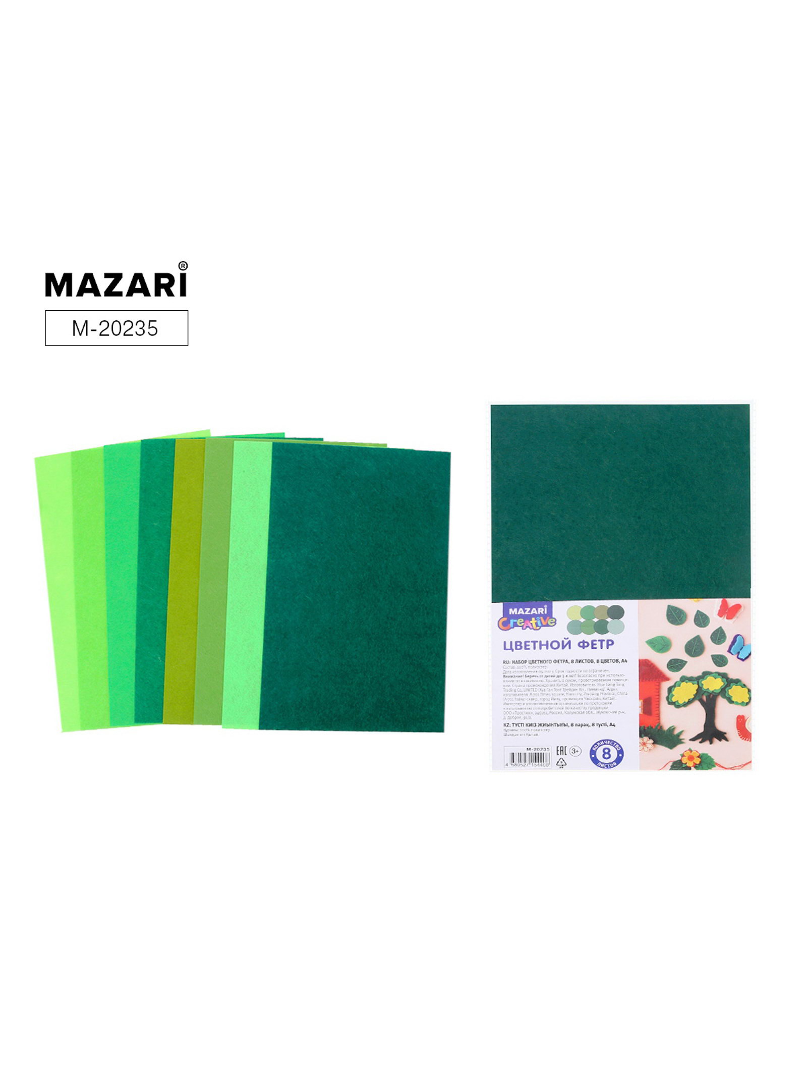 Фетр "Зеленый" 8 листов, 8 цветов, формат А4, толщина 1 мм, MAZARI, Китай