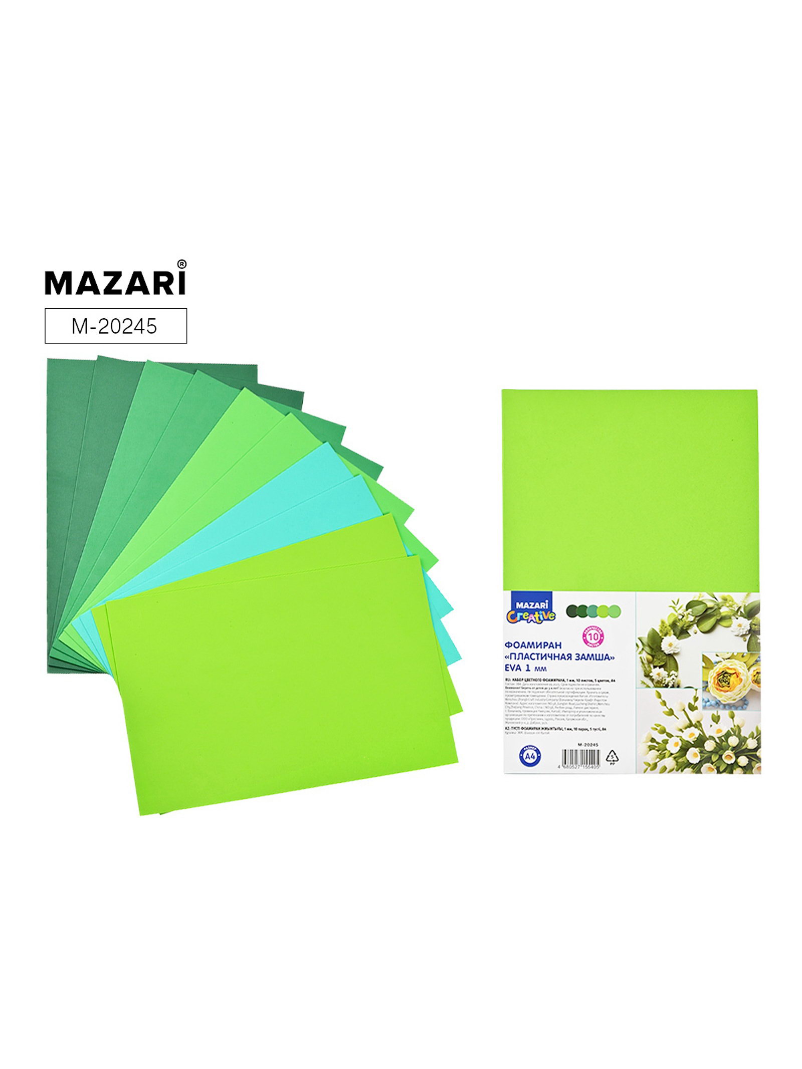 Фоамиран цветной "Зеленые оттенки", 10 листов, 5 цветов, формат А4, толщина 1 мм, MAZARI, Китай