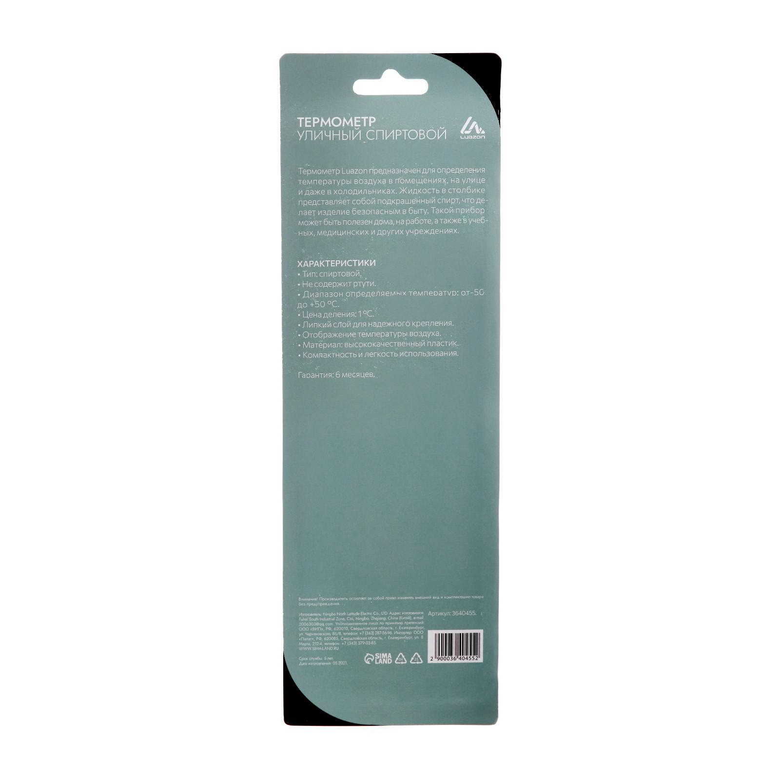 Размер упаковки: 9 x 2.5 x 28.3 см. Жидкостный: Да Назначение: Уличный Гарантийный срок, мес.: 6 tnved: 9025118000 Вид: Термометр Материал корпуса: Пластик Термометр универсальный LuazON предназначен для определения температуры на улице и в помещениях. Проводит измерение в диапазоне от -50°C до +50°C. Оснащён липким слоем для закрепления на плоской поверхности. Комплектация: