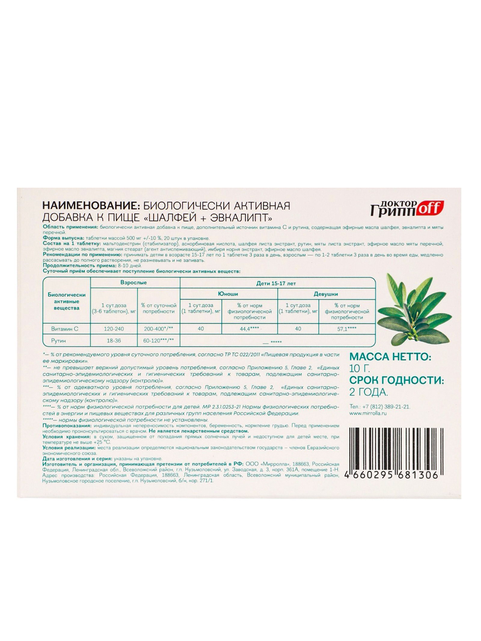 Шалфей + Эвкалипт 20 таблеток, Доктор ГриппOFF, Россия